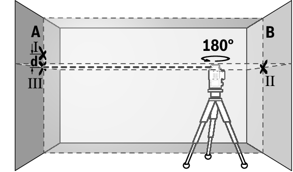 • Align the height of the measuring tool (using the tripod or by placing objects underneath as required) so that the point where the laser lines cross exactly hits the previously marked point Ⅱ on wall B.