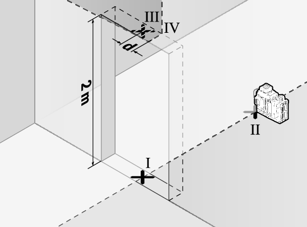 • Mark the centre of the vertical laser line on the floor of the door opening (point Ⅰ), 5 m away on the other side of the door opening (point Ⅱ) and on the upper edge of the door opening (point Ⅲ).