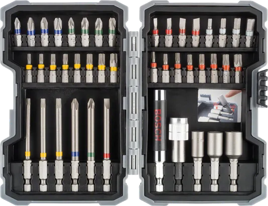 | 2 607 017 164 | PH1; PH2; PH3; PZ1; PZ2; PZ3; SL3; SL4; SL5; SL6; HEX3; HEX4; HEX5; HEX6; T10; T15; T20; T25; T27; T30; T40; TH10; TH15; TH20; TH25; TH27; TH30; TH40 | 25; 25; 25; 25; 25; 25; 75; 75; 75; 75; 48-50 | Set Content: PH1, PH2 (2x), PH3. PZ1, PZ2 (2x), PZ3. SL3, SL4, SL5, SL6. H3, H4, H5, H6, T10, T15, T20 (2x), T25, T27, T30, T40, TH10, TH15, TH20 (2x), TH25, TH27, TH30, TH40, PH2, PZ2, SL6, T15, T20, T25, Nutsetter with permanent magnet for hex screws 6 mm, 8 mm, 10 mm | 43 Pcs | Find a local dealer |
